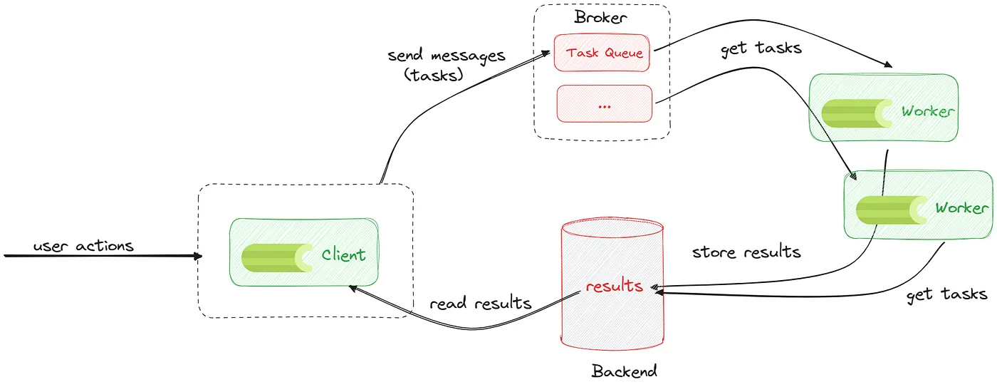 可以看到下图中,图片来源Unlocking Scalable Task Processing with Celery, Google Cloud Pub/Sub, and Google Cloud Storage: Part 2,Celery的Broker是支持RabbitMQ和Redis的,用来接收客户端发来的任务请求,并将这些待运行任务存储到任务队列里面。和我们之前手动使用数据库的方式不同,使用队列存储待运行任务的方案会更加灵活,方便后续对任务进行优先级调度。Celery的Worker则通过Pull的方式从Broker中获取待运行的任务,并将最终结果存储到Backend里面,而Backend一般常用的也是RabbitMQ和Redis,当然如果有持久化的需求,就得上MySQL或者PostgreSQL之类的数据库存储。